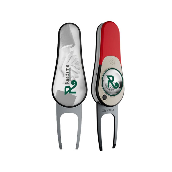Lichtgewicht inklapbare pitchfork gemaakt van hoogwaardig ABS kunststof, voorzien van een magnetische ball marker met doming en een full colour bedrukking op de achterzijde