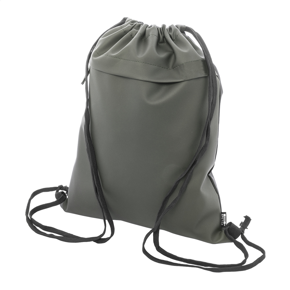 RPET tas met trekkoord met PU-coating aan de voorkant en een voorvak met ritssluiting. PU gecoat 600D RPET polyester met onderscheidend RPET-label.