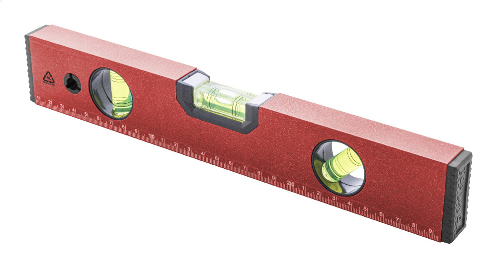 Magnetisch waterpas van gerecycled aluminium met drievoudige waterpas (horizontaal, verticaal en 45°) en liniaal van 30 cm.