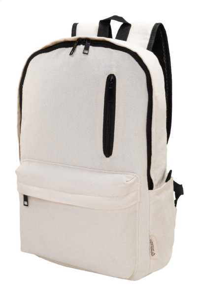 Recycled canvas rugzak met rits hoofdvak, gewatteerde laptop (15 ") compartiment, 2 rits voorvak, zijzakken, trolleyband, gewatteerde rug - en schouderbanden.70% gerecycled katoen en 30% RPET polyester. Met onderscheidend gerecycled katoenen label.