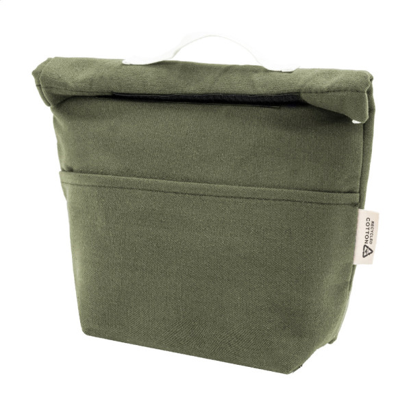 Gerecycleerde canvas rolltop koeler tas met voorvak, aluminium vulling en klittenbandsluiting. 70% gerecycled katoen en 30% RPET polyester. Met onderscheidend gerecycled katoenen label.
