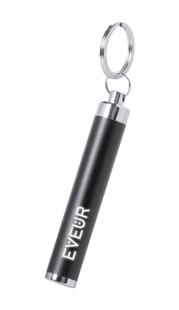 Plastic zaklamp met 1 LED en metalen sleutelhanger. Na gravure wordt het logo verlicht. Incl. knoopcel batterijen.