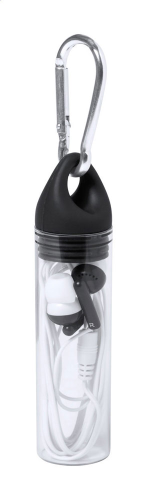 In-oor oordoppen met 3,5mmm audio jack plug. In plastic doosje met karabijnhaak en bijpassende gekleurde dop.