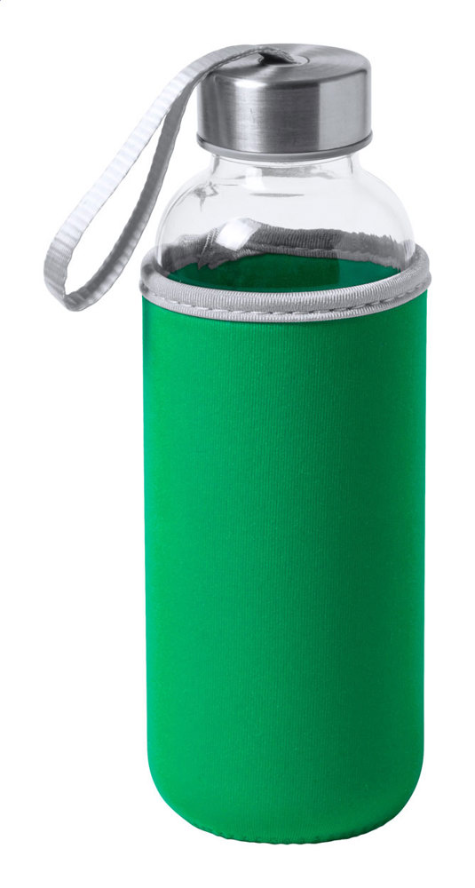 Glazen fles met draagriempje op de dop en gekleurde neopreen hoes. 420 ml. Niet geschikt voor koolzuurhoudende dranken.