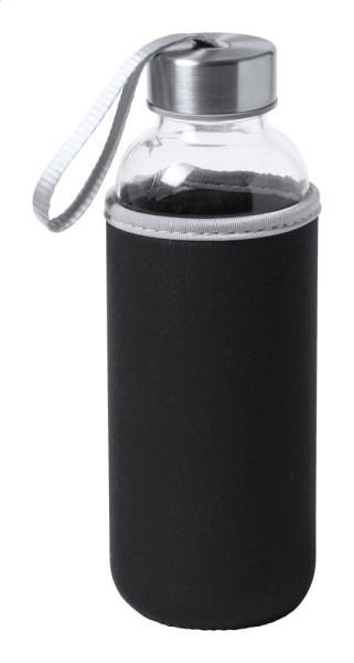 Glazen fles met draagriempje op de dop en gekleurde neopreen hoes. 420 ml. Niet geschikt voor koolzuurhoudende dranken.
