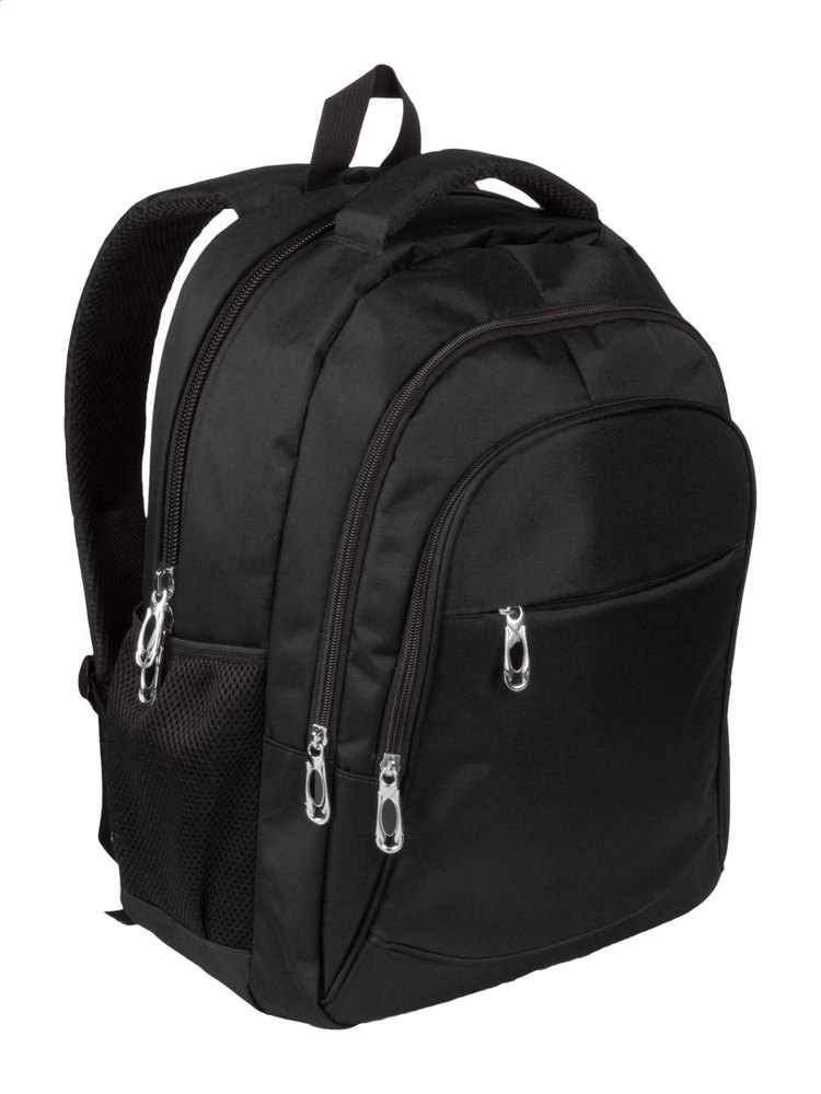 600D nylon rugzak met meerdere geritste compartimenten, gevoerd laptop compartiment (15"), gevoerde rug- en schouderbanden.