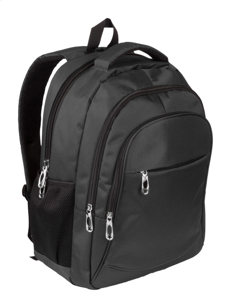 600D nylon rugzak met meerdere geritste compartimenten, gevoerd laptop compartiment (15"), gevoerde rug- en schouderbanden.