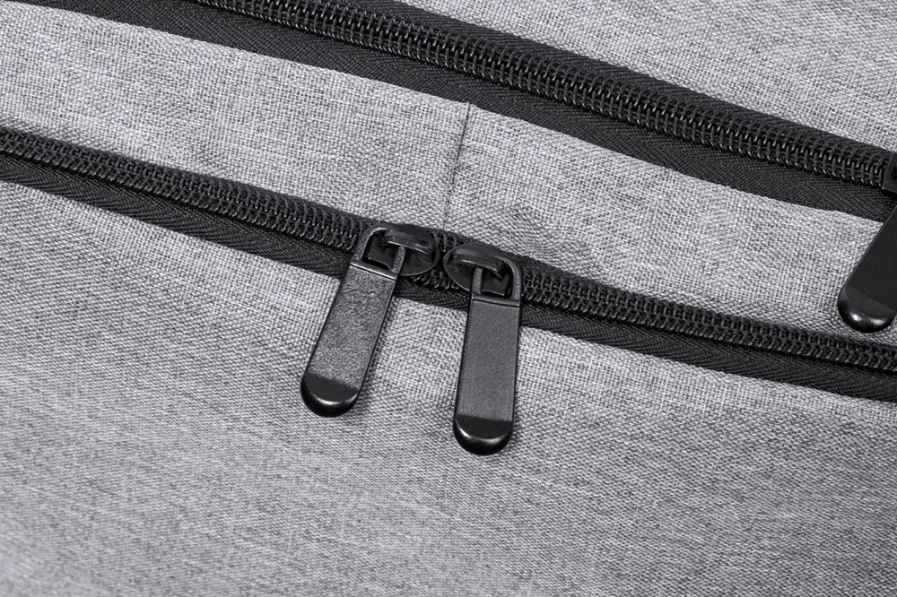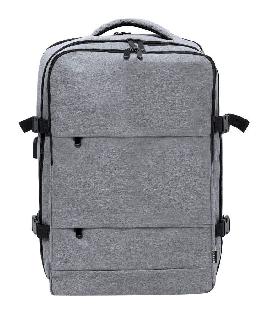 Waterbestendige RPET-rugzak met 3 hoofdcompartimenten met rits, 2 voorzakken met rits, zijvak met rits en verborgen antidiefstalvak. Met gevoerde laptop- (17") en schoenencompartimenten, gevoerde rug- en schouderbanden. Met trolleyband en ingebouwde USB-aansluiting voor powerbanks. 300D RPET-polyester met kenmerkend RPET-label.
