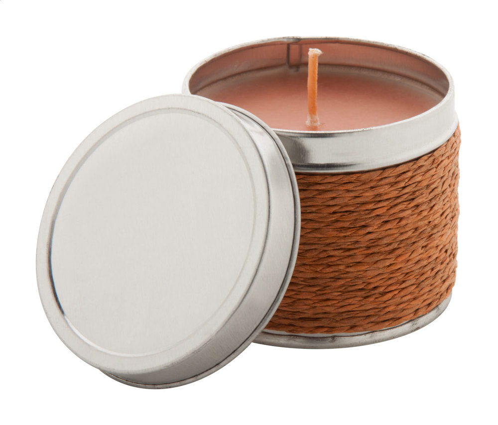 Geurkaarsen en metalen doos, bedekt met touw.