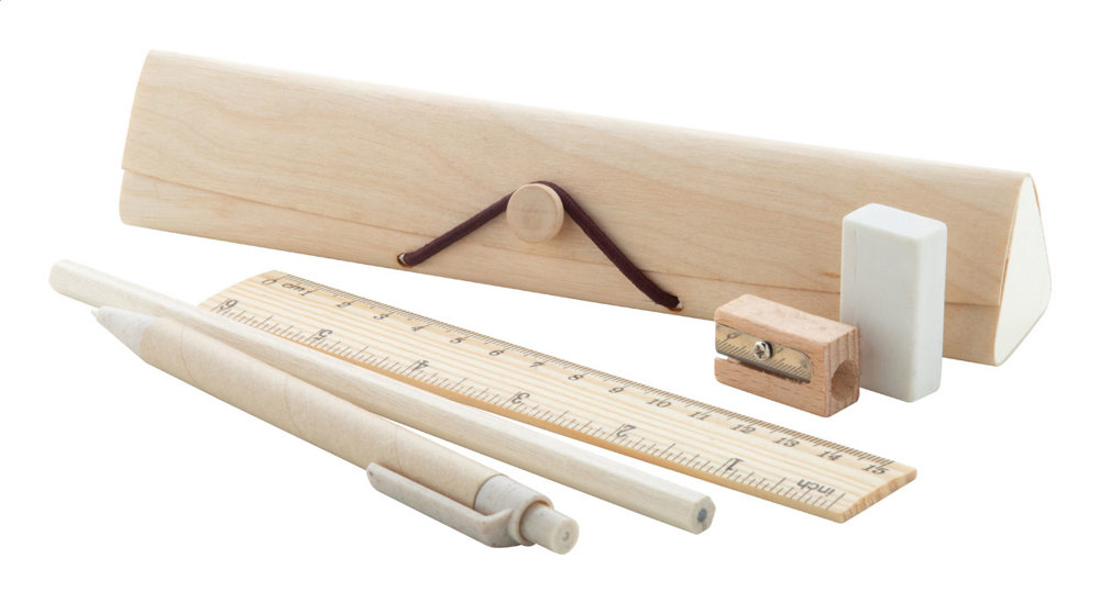 5-delige houten bureauset in houten etui. Inclusief gerecycled papier balpen (met blauwe vulling), potlood (HB, ongeslepen), liniaal 15 cm, puntenslijper en gum.