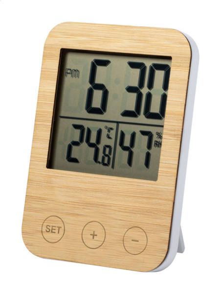 Bamboe digitale klok en weerstation met temperatuur- en vochtigheidsweergave. Werkt op 2 AAA-batterijen, niet meegeleverd.