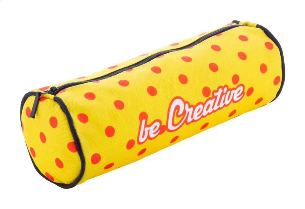 Custom made ronde etui met rits in 600D RPET polyester. Met all-over sublimatie bedrukking en onderscheidend RPET-label. MOQ: 50 stuks.