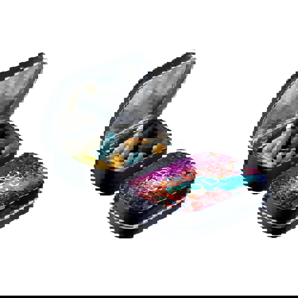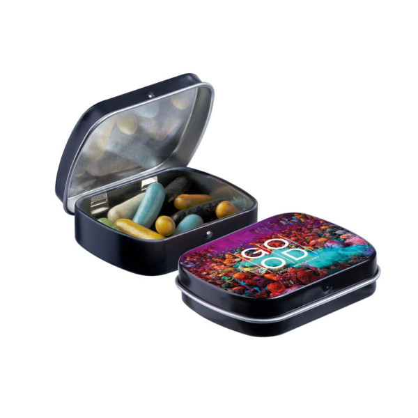 Mini wit scharnierblikje met ca. 23 gram Mini Choco's, voorzien van een full colour bedrukking. Inclusief ingrediëntensticker en seal.
