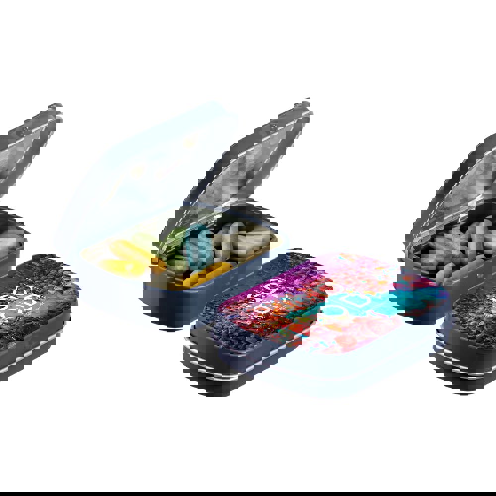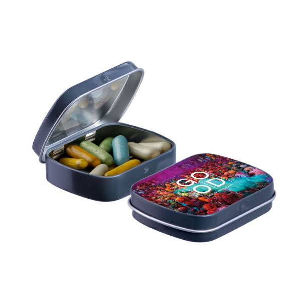 Mini wit scharnierblikje met ca. 23 gram Mini Choco's, voorzien van een full colour bedrukking. Inclusief ingrediëntensticker en seal.