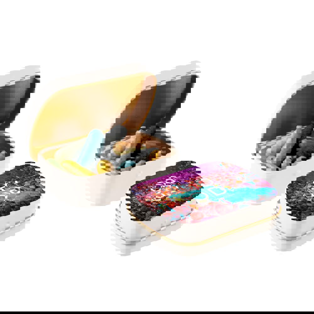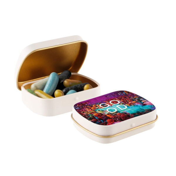 Mini wit scharnierblikje met ca. 23 gram Mini Choco's, voorzien van een full colour bedrukking. Inclusief ingrediëntensticker en seal.