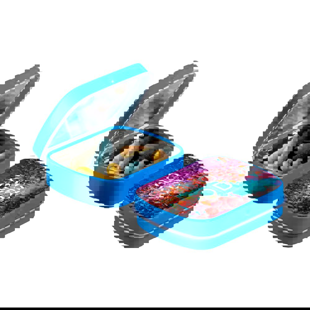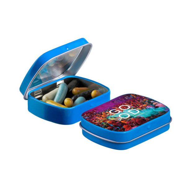 Mini wit scharnierblikje met ca. 23 gram Mini Choco's, voorzien van een full colour bedrukking. Inclusief ingrediëntensticker en seal.