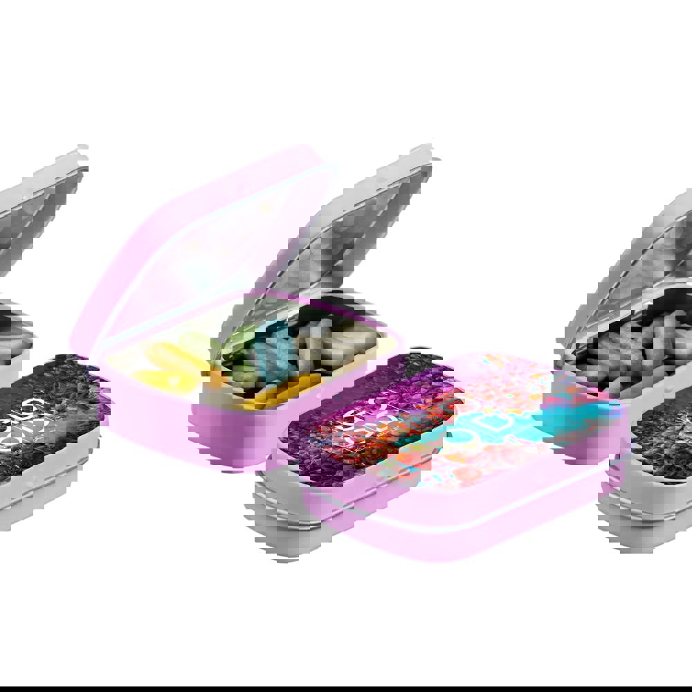 Mini wit scharnierblikje met ca. 23 gram Mini Choco's, voorzien van een full colour bedrukking. Inclusief ingrediëntensticker en seal.
