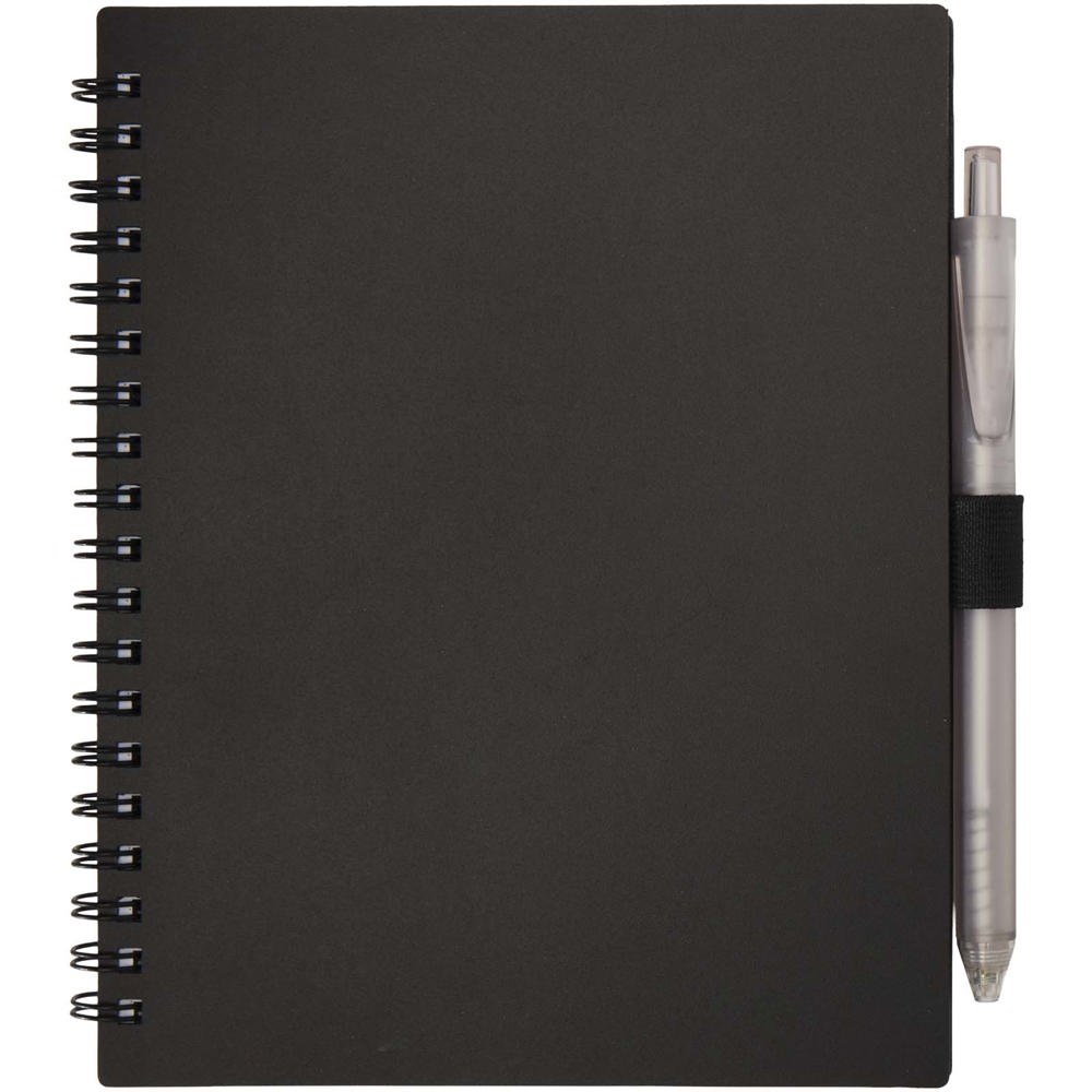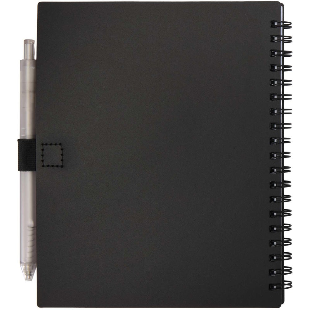 De Niove notitieboek met zachte kaft is gemaakt van gerecycled plastic met 70 gestippelde vellen papier van 70 g/m². Het notitieboek heeft vierkante hoeken en een lus voor een pen. Notitieboekformaat: 140 x 178 mm. De balpen is eveneens gemaakt van gerecycled plastic. Inktkleur: Blauw. Schrijflengte: 1000 meter. Stiftmaat: 1,0 mm.