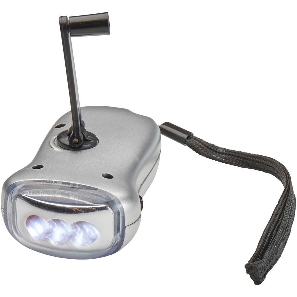 Compacte zaklamp op zonne-energie met een helderheid van 10.000 mcd. De zaklamp kan ook handmatig worden aangedreven door aan de hendel te draaien.