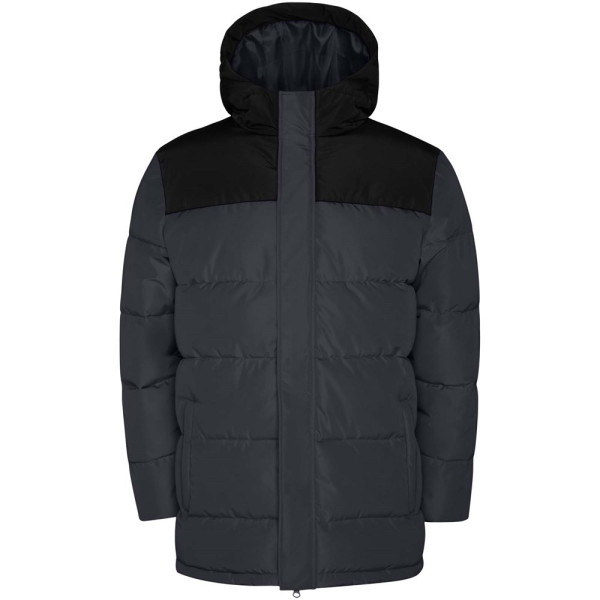 Gewatteerd jack met vaste capuchon. Rits aan de voorkant bedekt met een sluiting. Kinbescherming. Twee zijzakken met rits. Elastische manchetten.