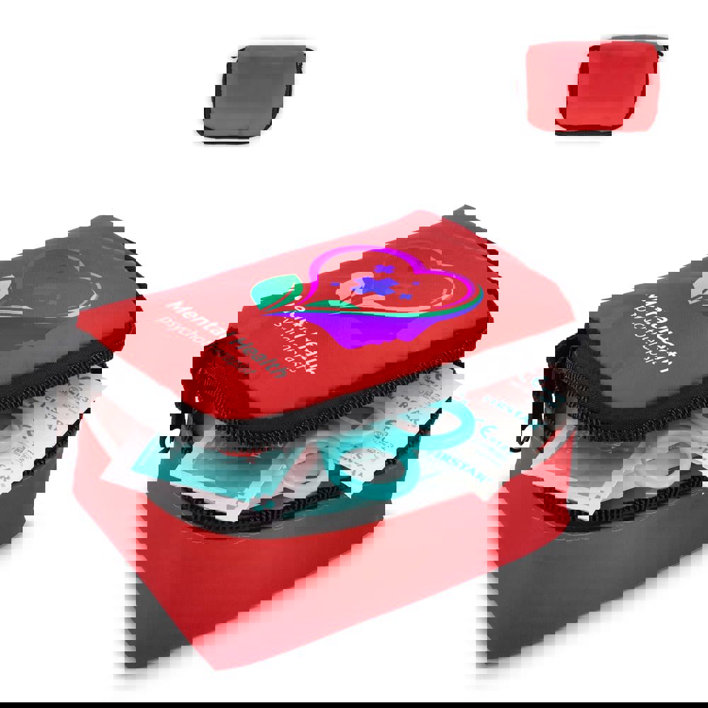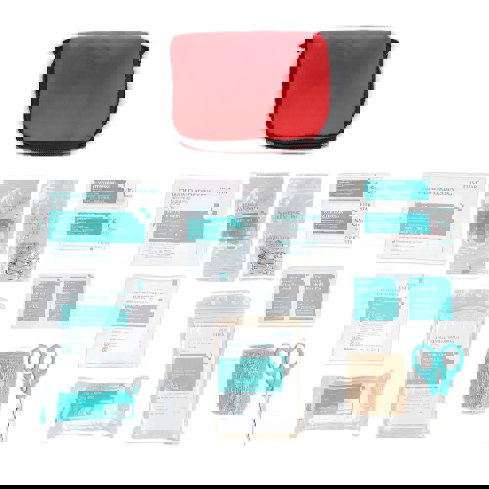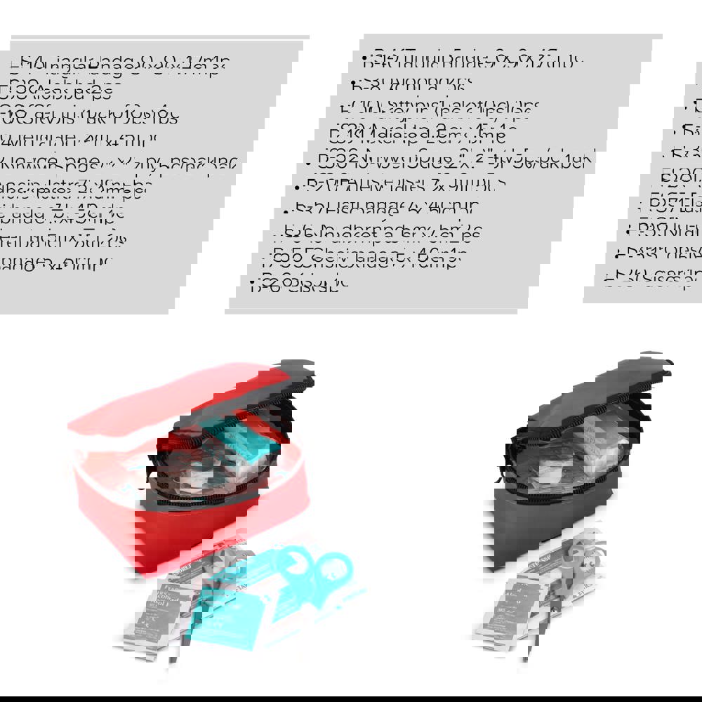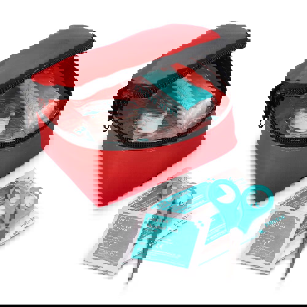 Deze EHBO set wordt geleverd in een nylon etui met klittenband bevestigings banden aan de onderzijde, zodat hij bijvoorbeeld aan een fietsstuur kan worden bevestigd of om de pols gedragen kan worden. Voldoet aan Europese normen. Ideaal voor fietsen, wandelen en outdoor-activiteiten. Inhoud: 1 × driekantverband 90 × 90 × 127 cm, 2 × alcoholpads, 1 × verpakking van 10 veiligheidsspelden, 1 × medische tape 1.25 cm × 4.5 m, 1 × pack van 5 non-woven sponzen 2" × 2" 4-laags, 5 × pleisters 72 × 19 mm, 1 × elastisch verband 7.5 × 450 cm, 2 × non-adherente pads 5 × 7.5 cm, 1 × cohesief verband 5 × 450 cm, 1 × schaar, 1 × pincet.