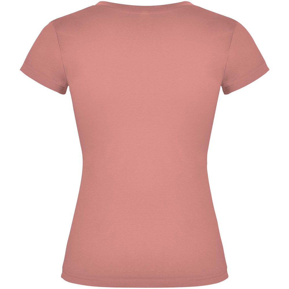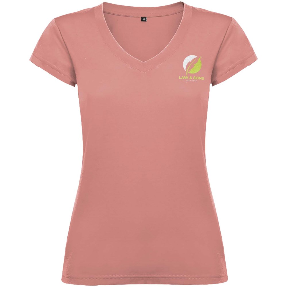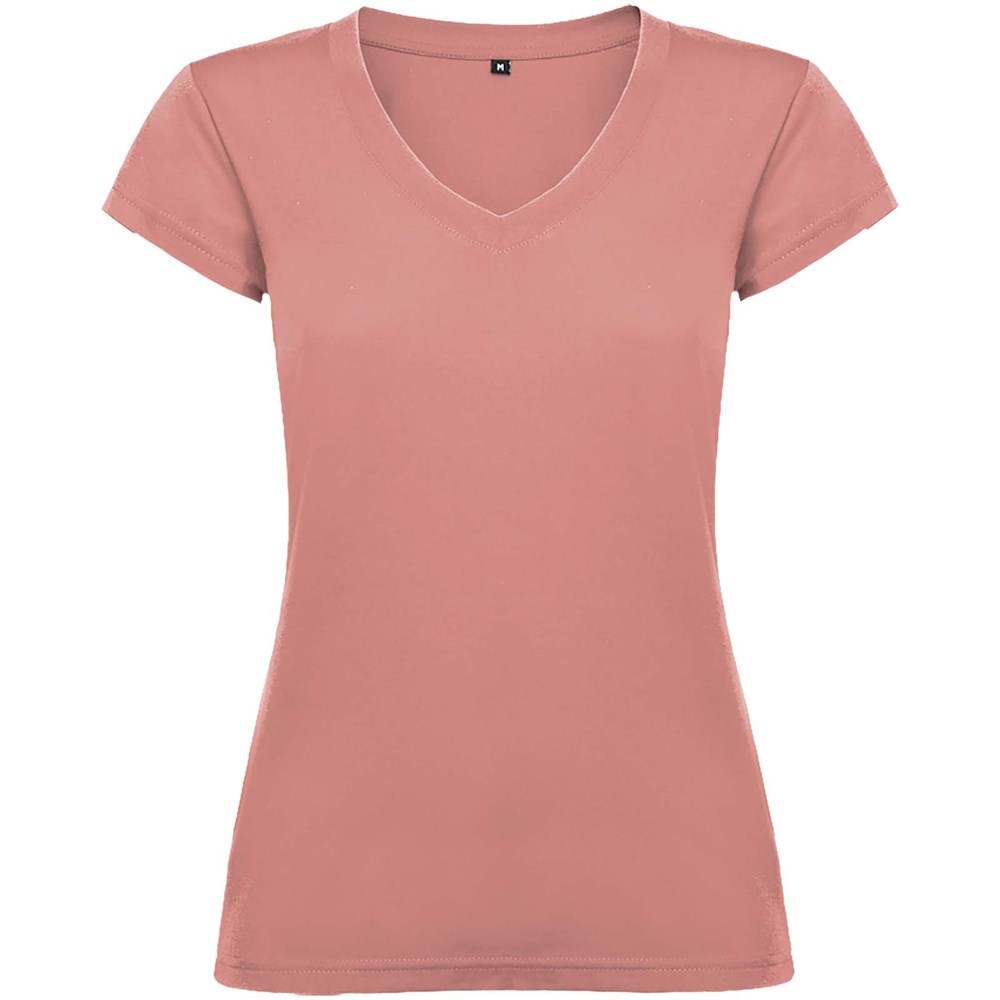 T-shirt met korte mouwen en V-hals voor dames, met 1x1 geribbelde afwerkingen. Slim-fit met zijnaden. Verwijderbaar etiket. Het model is 174 cm en draagt maat S.