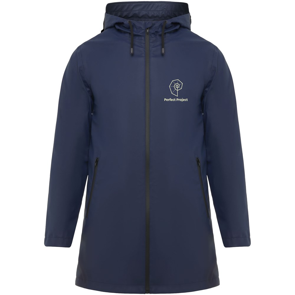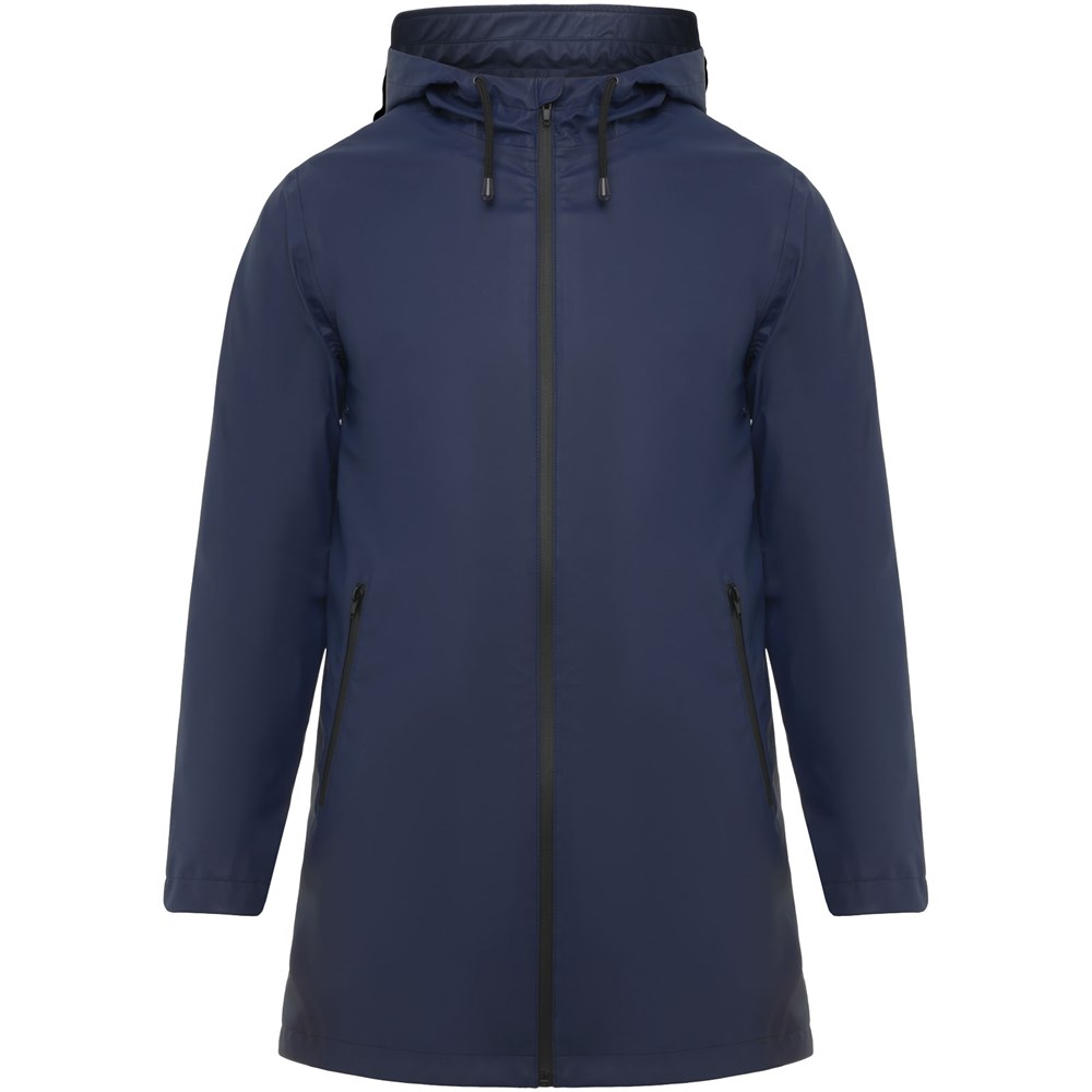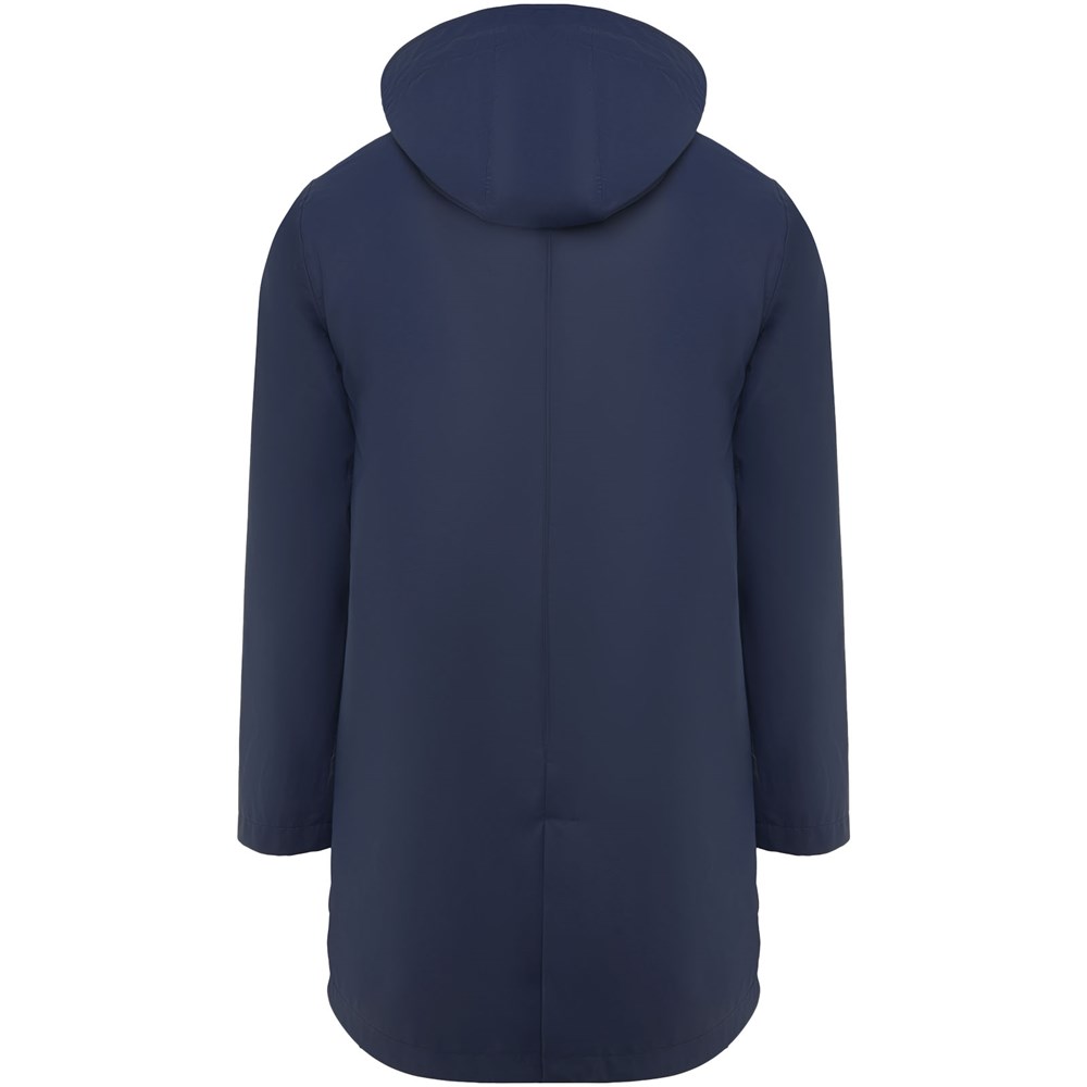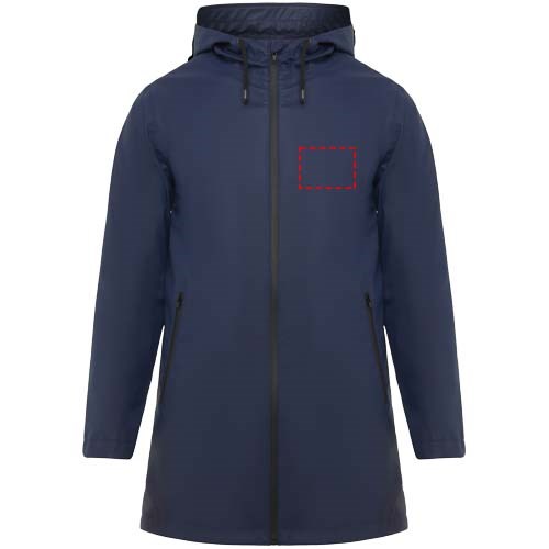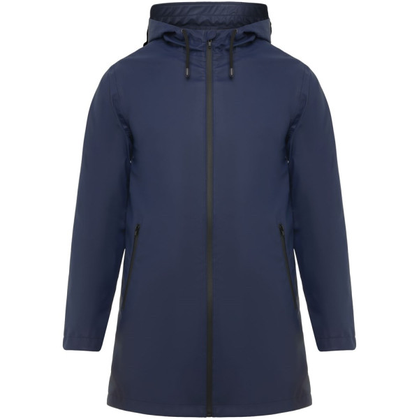 Waterdichte regenjas. Capuchon met klep. Door hitte gesealde ritsen en naden. Contrasterende details in zwart. Twee zijzakken met rits. Split aan de achterkant. Verwijderbaar etiket. Waterbestendig. Het model is 185 cm en draagt maat M.