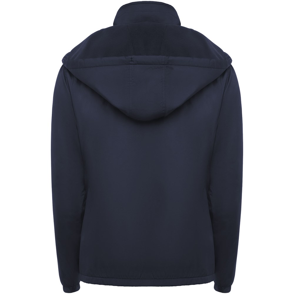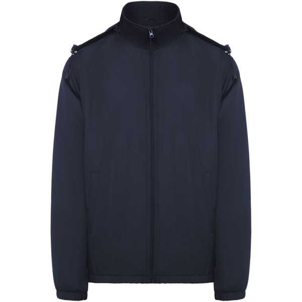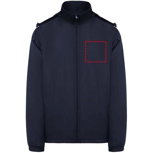 Licht waterdicht jack. Hoge kraag en opvouwbare capuchon met verstelmogelijkheden. Voering van microfleece. Rits aan de voorkant en kinbeschermer. Elastische manchetten. Twee zijzakken met ritssluiting. Binnenzak links op de borst. Verwijderbaar etiket. Waterbestendig. Winddicht. Het mannelijke model is 184 cm en draagt maat L en het vrouwelijke model is 174 cm en draagt maat S.