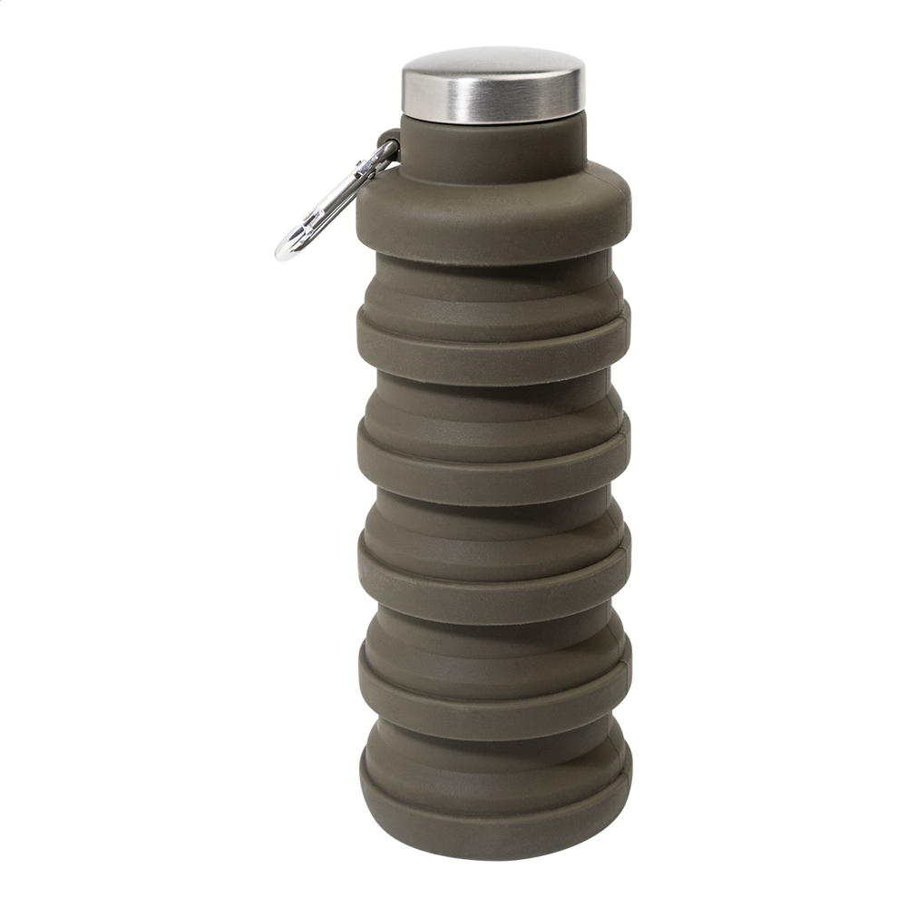 Inklapbare siliconenfles met roestvrijstalen deksel en aluminium karabijnhaak. 500 ml.