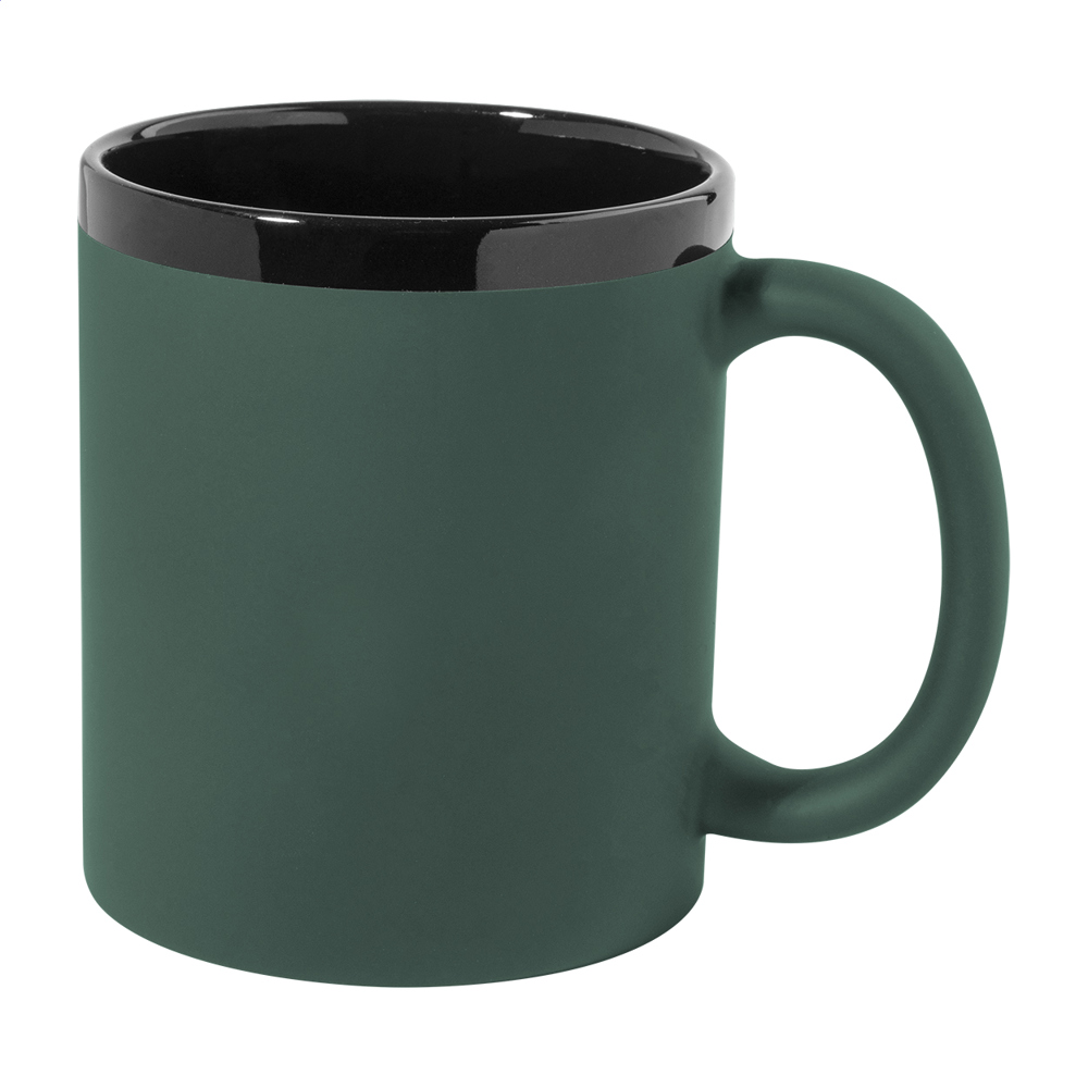 Keramische mok met soft-touch rubberen afwerking en zwarte binnenkant en rand, 300 ml. Met speciale coating voor graveren past het gegraveerde logo bij de binnenkleur. In kraftpapier doos.