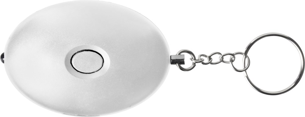 ABS persoonlijk alarm met stalen sleutelring. Het LED licht wordt geactiveerd met de drukknop. Het alarm wordt geactiveerd door de pin eruit te trekken. Inclusief batterijen.