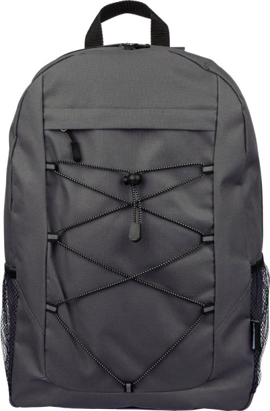 Avontuurlijke rugzak van 600D rPET-polyester met trekkoordsluiting en groot hoofdvak met ritssluiting. Voorzien van mesh zijvakken, elastische banden aan de voorkant om een deken of fles vast te zetten, en een open voorvak met ritssluiting voor decoratie. Voorzien van verstelbare schouderbanden en een rPET-label.