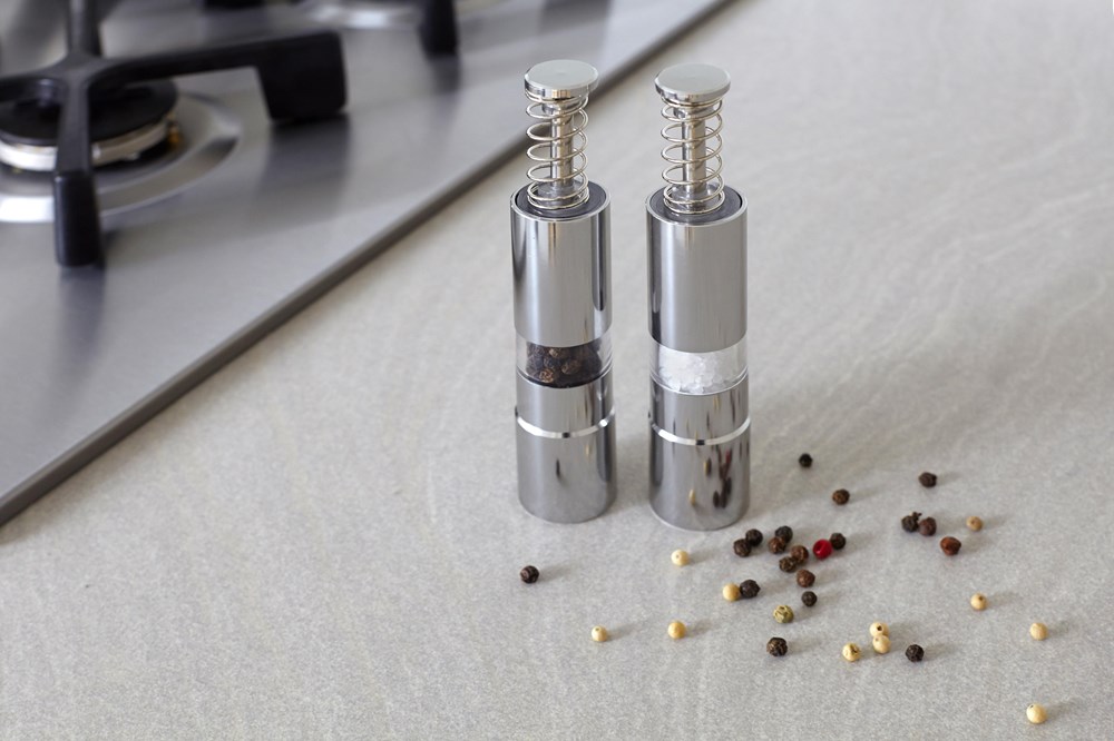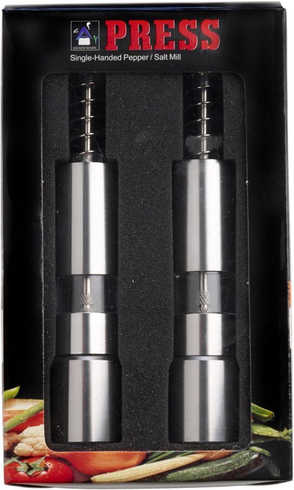 Roestvrijstalen (s/s304) peper- en zoutmolen met drukmechanisme. Verpakt in geschenkverpakking.