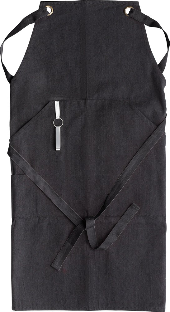 Polyester en katoenen schort met gekleurde banden en voorvak. Inclusief flesopener.