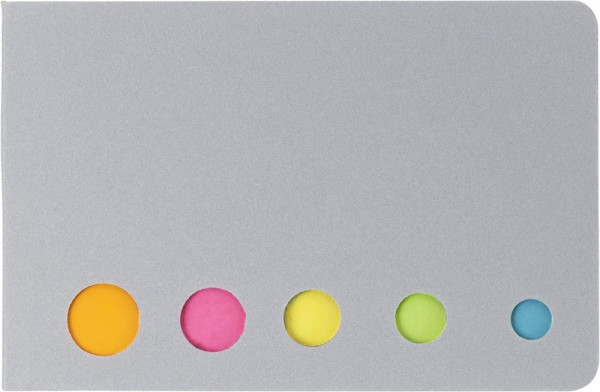 Kartonnen omslag met ca. 100 zelfklevende memoblaadjes in verschillende kleuren. Cover: 300g/m², sticky: 75g/m².