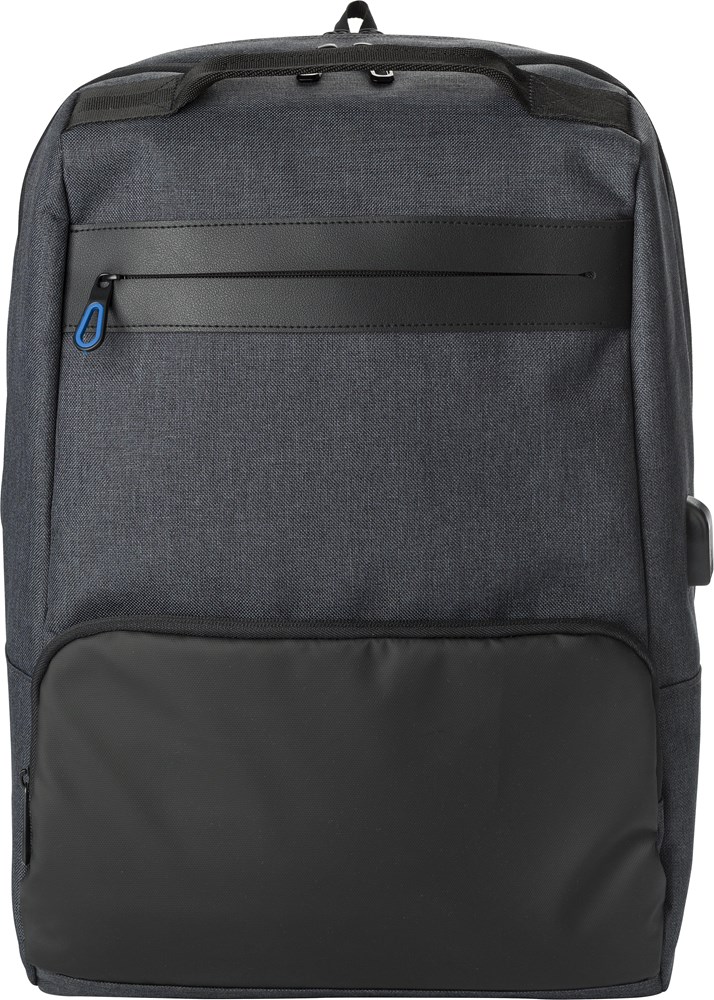 PVC rugtas met twee compartimenten, één geschikt voor een laptop (15 inch). De rugtas heeft een antidiefstal vak aan de achterzijde en aan de voorkant twee ritsvakken. De verstelbare schouderbanden zijn gewatteerd.