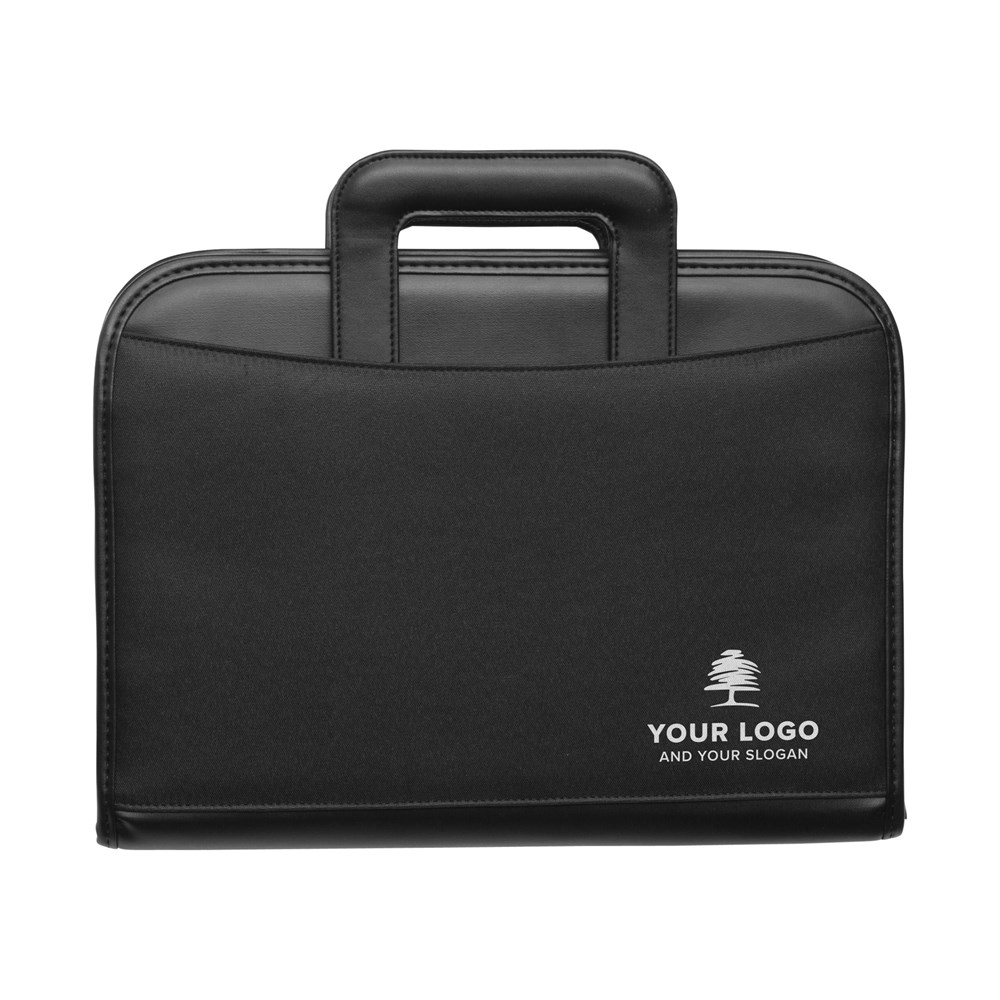 Microfiber polyester documenten map (A4), met dual power calculator/rekenmachine (8-digits), diverse insteekvakken, ritssluiting, handgreep, incl. schrijfblok en batterij.