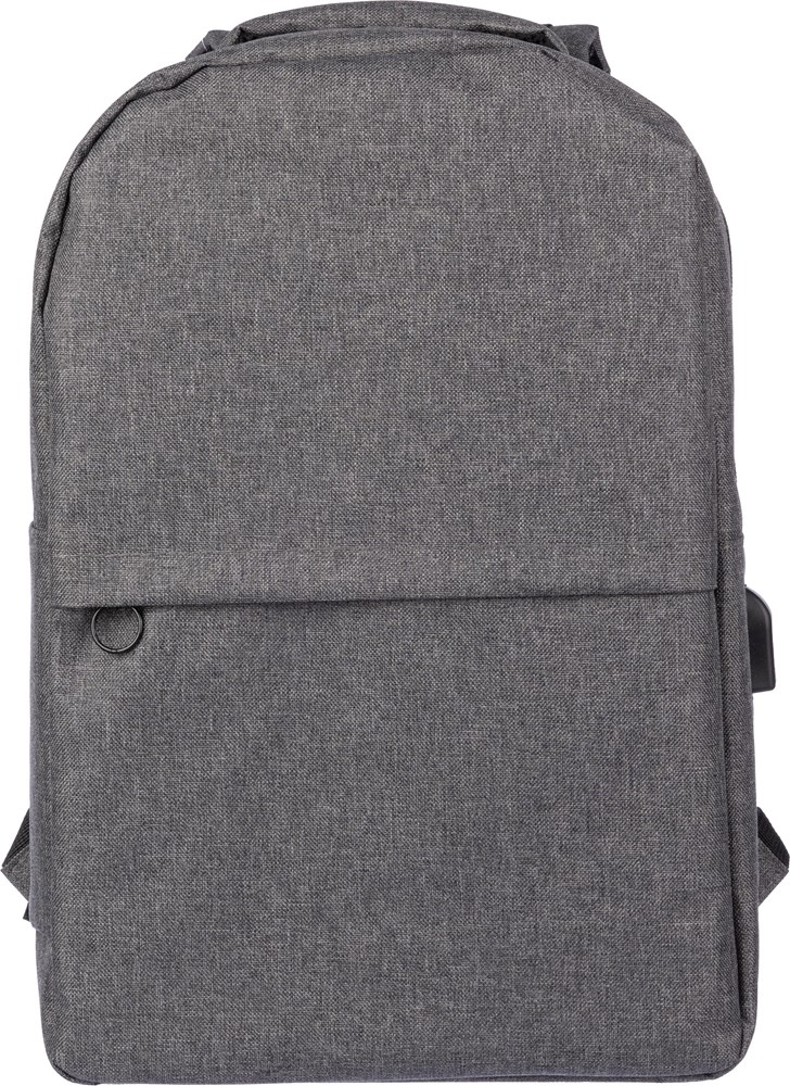 rPET (600D) rugzak met USB-poortopening (en USB-kabel binnenin) met een groot vak met rits aan de bovenkant en een vak met rits aan de voorkant. Binnenin is er een vak voor 10-inch apparaten en één voor 15-inch apparaten. Met verstelbare banden.