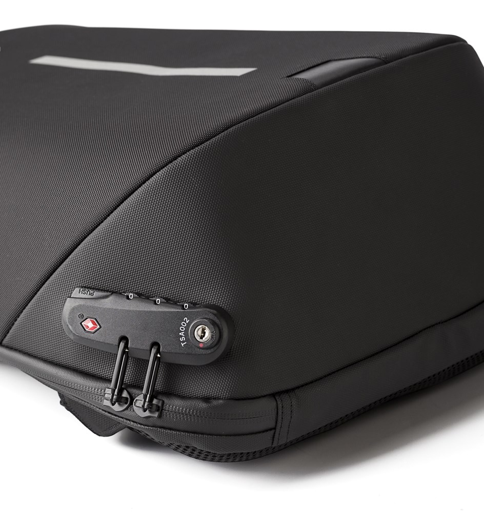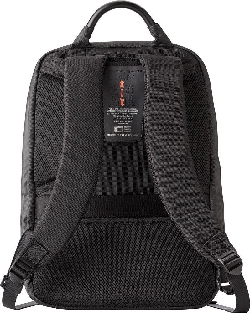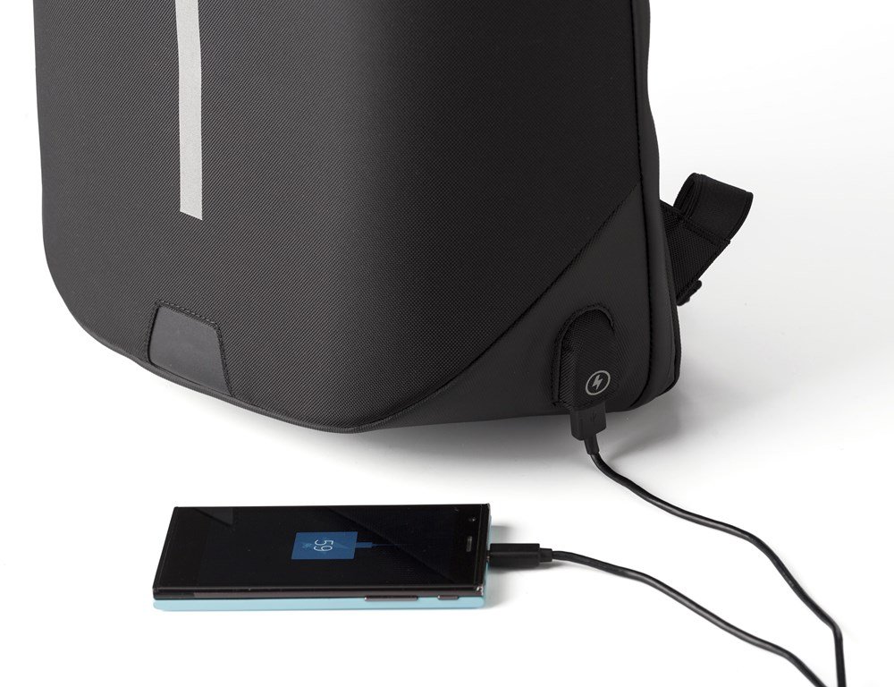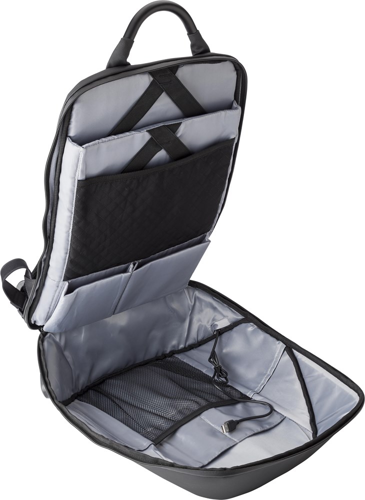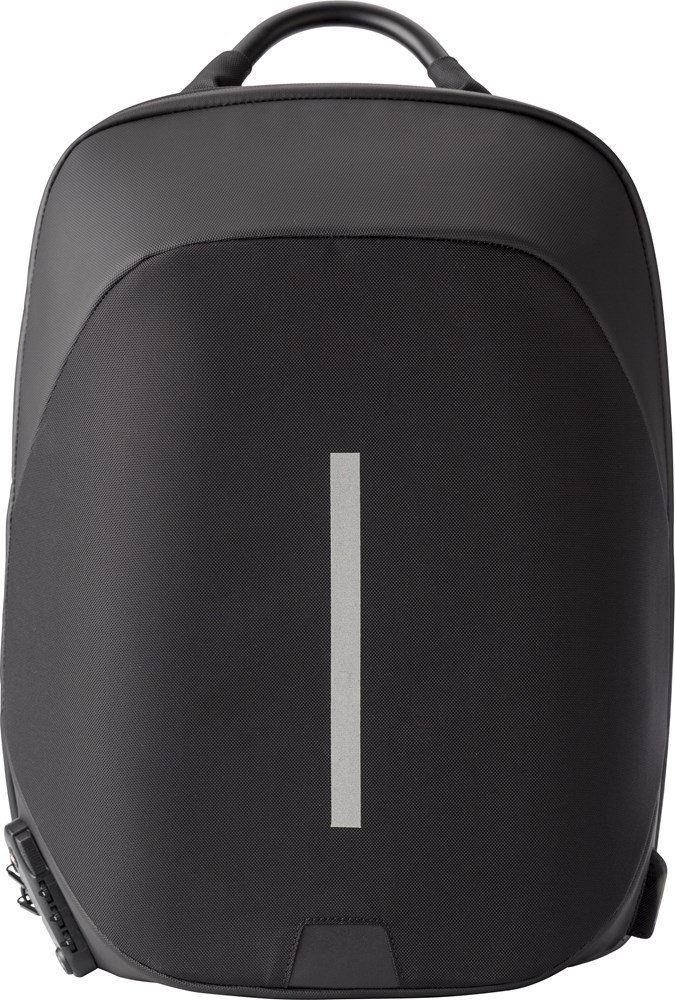 Nylon (1200D) rugzak met gewatteerd laptopvak (15 inch). Gewatteerde rug en schouderbanden, die ook verstelbaar zijn. Aan de rits zit een drie-cijferig slot. Inclusief USB poort en kabel en reflectieve streep.