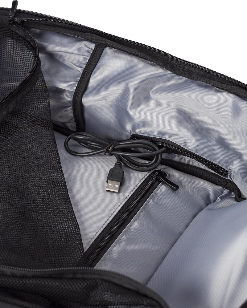 PU (600D) rugzak met vakken aan de voorkant en zijkanten en een laptopvak (15 inch) aan de binnenzijde. Gewatteerde rug en schouderbanden, die ook verstelbaar zijn. Speciaal systeem om belasting op de rug te verminderen. Inclusief USB poort en kabel.