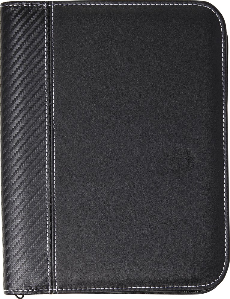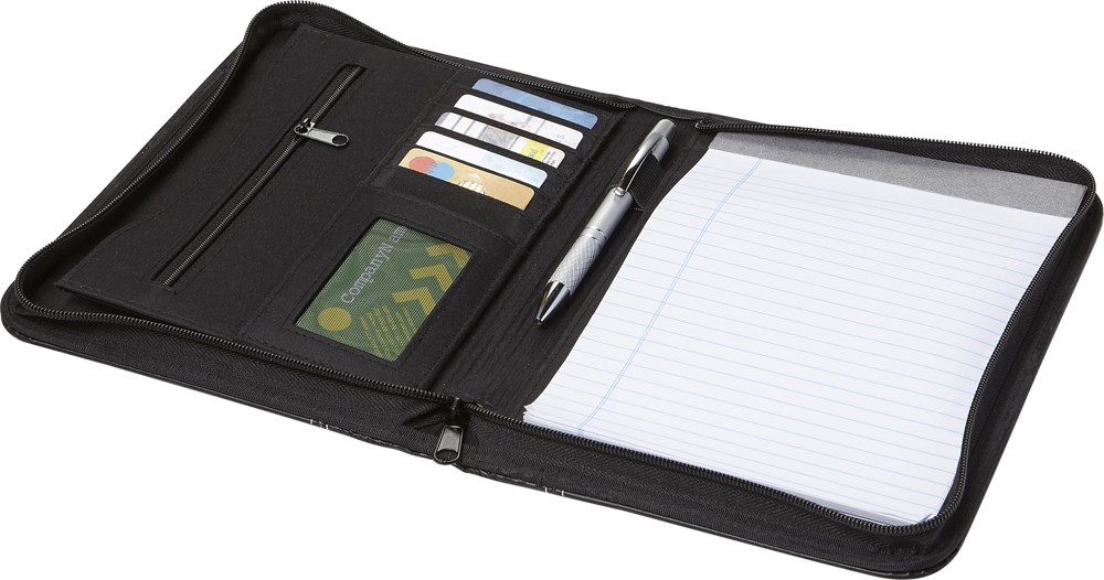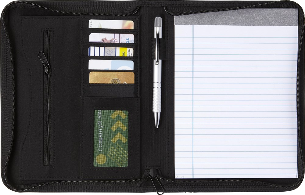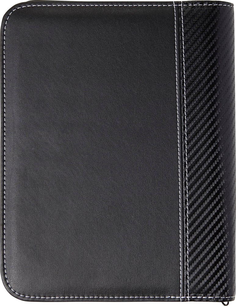 Documentenmap (A5) met PU omslag met ritssluiting, witte stiksels, een elastische penlus, 6 verschillende insteekvakjes, gelinieerd schrijfblok (30 vel) en microfiber lining. Excl. pen.