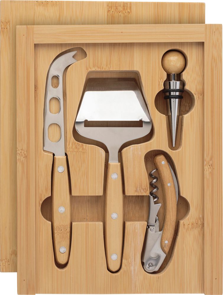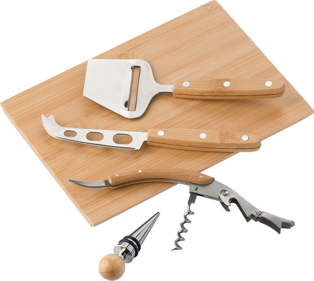 Bamboe kaas- en wijnset, bestaande uit: kurkentrekker, wijnstop, kaasrasp en mes.meer