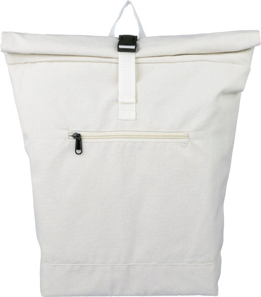 Gerecyclede polycotton (330 gsm) roll-top rugzak met een 210D polyester voering en een kunststof gespsluiting. Heeft een capaciteit van 15L, een ruim hoofdvak met ritssluiting, een 15-inch laptopvak, twee binnenvakken en één buitenvak. Het ontwerp bevat een draaglus aan de bovenkant, gewatteerde, verstelbare schouderbanden en een klein voorvak met ritssluiting. Draagvermogen: 14 kg. Inclusief label.