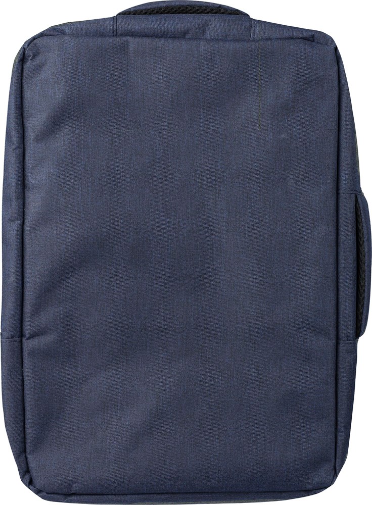 Gerecyclede rPET polyester 300D laptoptas met een 210D rPET-voering. Voorzien van een ruim hoofdvak met ritssluiting en meerdere insteekvakken, een laptopvak met klittenbandsluiting geschikt voor een 15-inch laptop, en een capaciteit van 12L. Het ontwerp bevat een verstevigde, geventileerde rug, verstelbare schouderbanden, een zijhandgreep en een trolleyband. Draagvermogen: 10 kg.