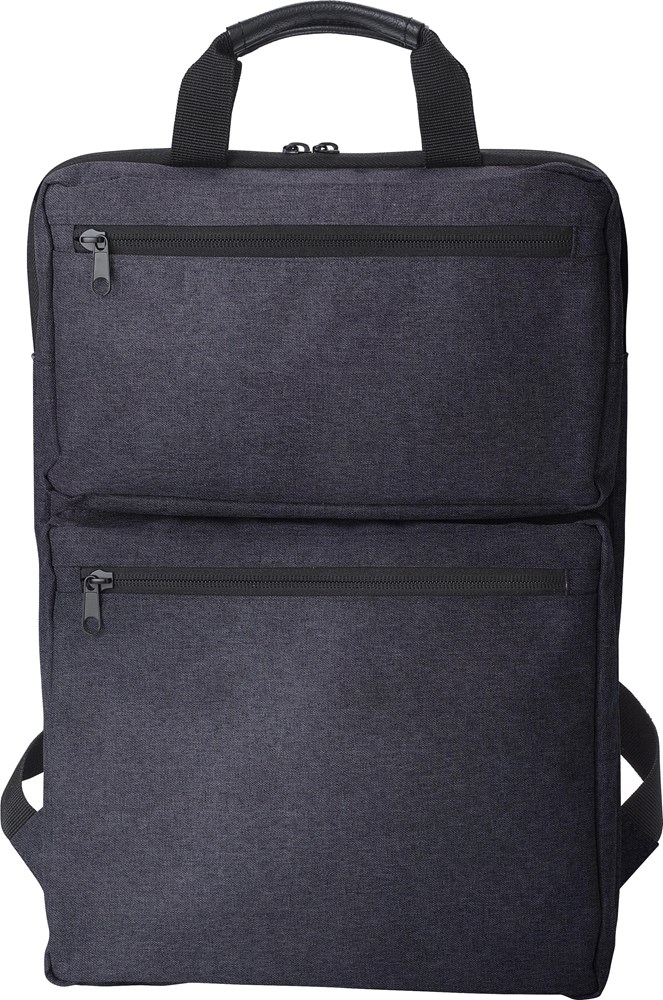Polycanvas (300D) rugzak met twee buitenvakken met ritssluiting en een laptopvak aan de binnenkant (15 inch). Met gewatteerde schouderbanden en twee korte handgrepen aan de bovenkant.