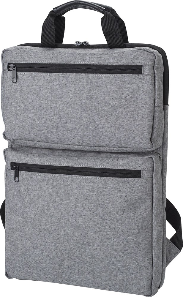 Polycanvas (300D) rugzak met twee buitenvakken met ritssluiting en een laptopvak aan de binnenkant (15 inch). Met gewatteerde schouderbanden en twee korte handgrepen aan de bovenkant.