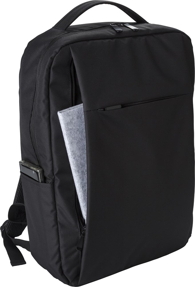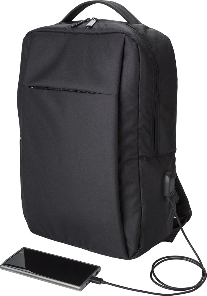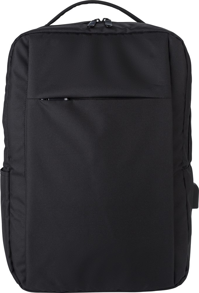 rPET (300D) laptop (16 inch) rugzak met 210D details. Binnenin meerdere vakken, laptopvak met klittenbandsluiting, één voorvak met rits. Opening met USB-A aan de zijkant.