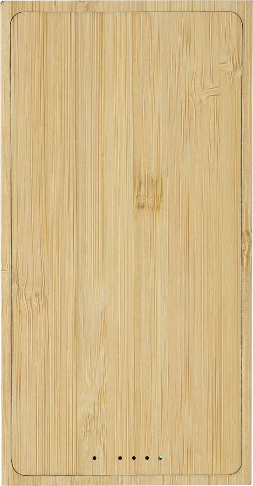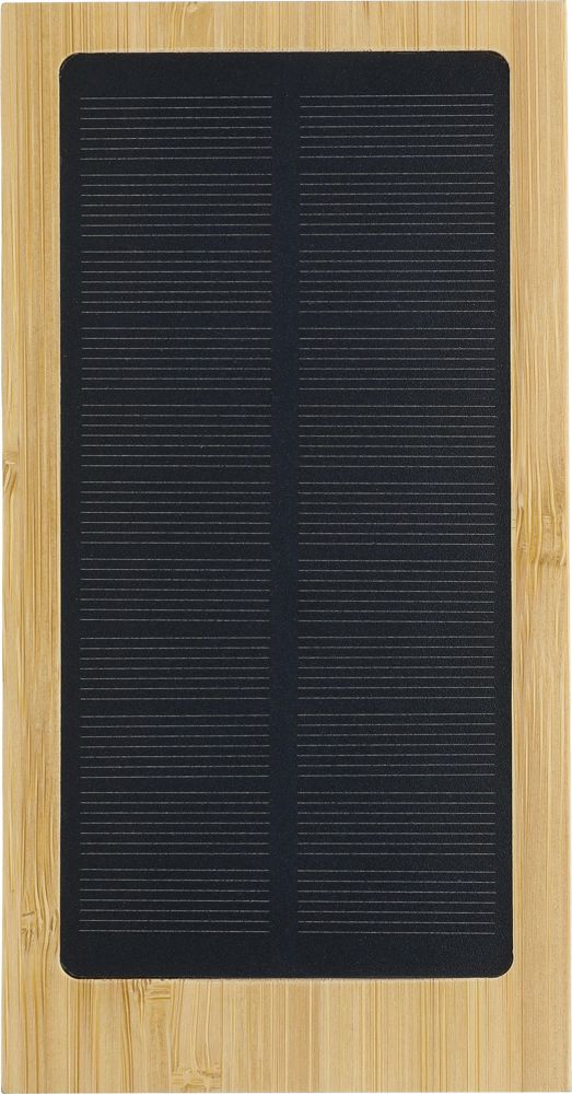 Bamboe zonne-energie powerbank met een capaciteit van 10.000 mAh, twee USB-A uitgangen en twee Type-C poorten voor invoer en uitvoer. Voorzien van een draadloze oplader aan de achterzijde met een lasergegraveerd draadloos symbool en vijf indicatielampjes. De bovenzijde bevat een zonnepaneel (6,3 x 12,8 cm). Draadloze output: 5V DC/1A (5W), draadloze oplaadafstand: 6 mm. Invoer/uitvoer via kabel: DC 5V/2.4A. Voorzien van bescherming tegen kortsluiting, overladen en diepontlading. Inclusief witte kabel van 30 cm. Individueel verpakt in een bruine kartonnen doos.