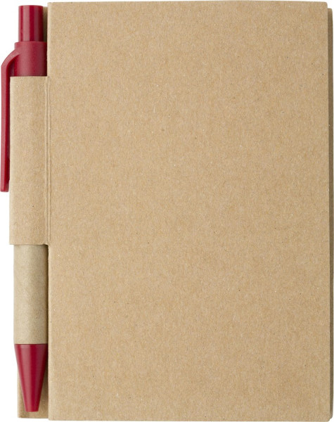 Kartonnen notitieboekje (80 vel gelinieerd papier), met een kartonnen lus en kartonnen pen, zwartschrijvend.