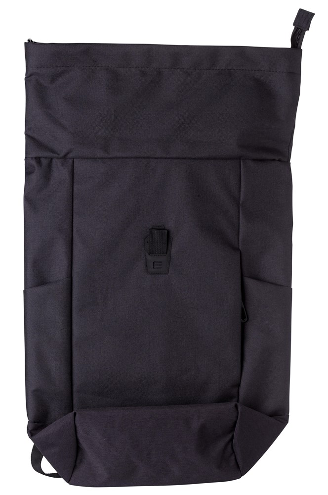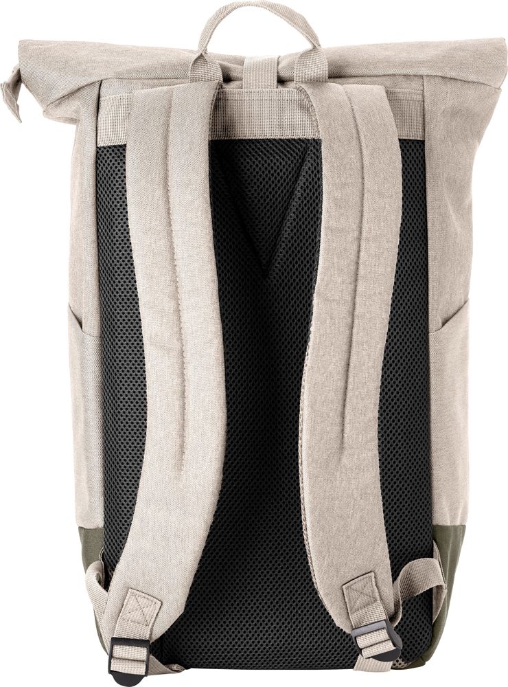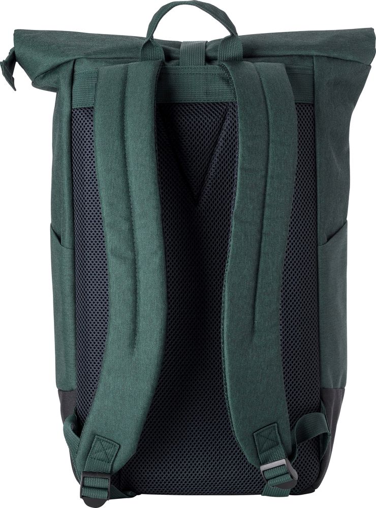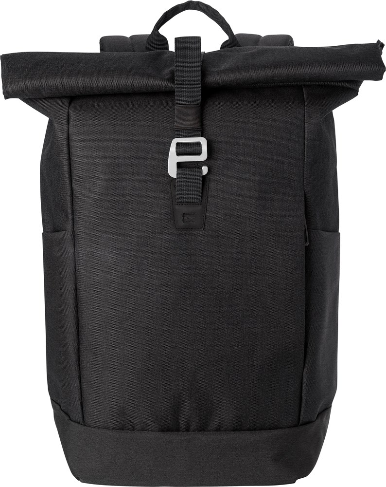 Polyester (600D) rolsluiting rugzak. Eén groot vak met ritssluiting met twee steekvakken en een laptopvak. Voorvak met ritssluiting. Gewatteerde achterkant en schouderbanden. Metalen haaksluiting.
